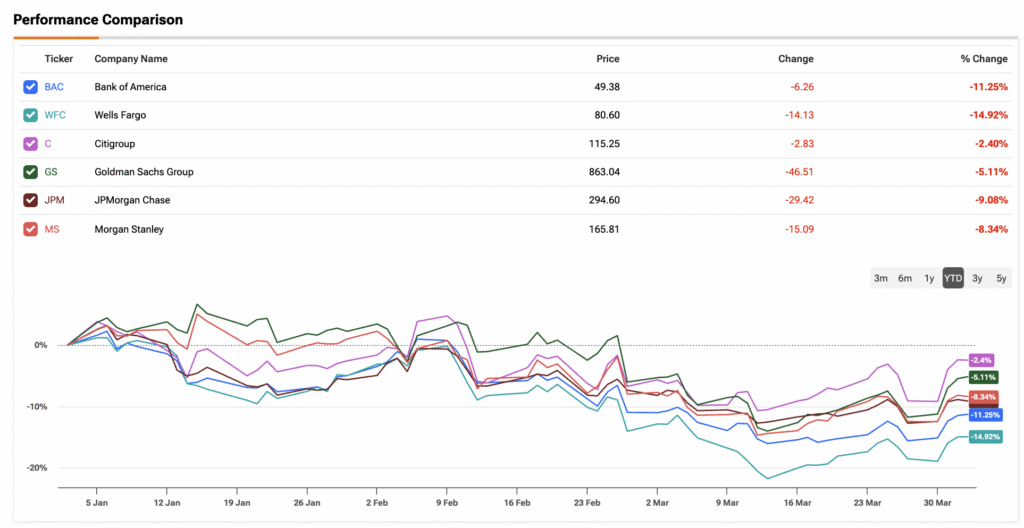 BAC heads into its Q1 earnings trading at around 1.2x book value, essentially in the middle of its range over the past 12 months. The stock traded at about 0.9x book value in April of last year, around the so-called “Liberation Day,” and roughly 1.5x book value in early February of this year. Compared to peers, the recent multiple compression has largely been sector-wide over the past couple of months, yet BAC still trades at a more pronounced discount to direct peers such as Wells Fargo WFC +0.52% ▲ , which sits closer to 1.5x book value.