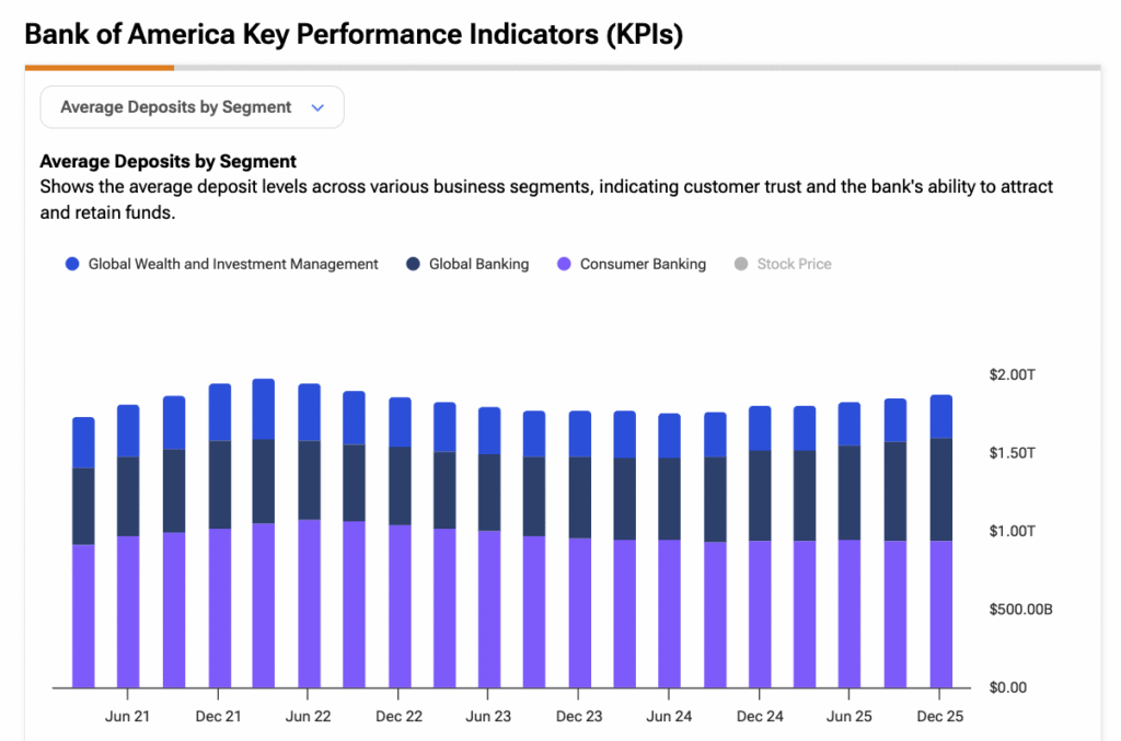 Given its massive funding base — holding roughly $2 trillion in deposits and benefiting from very low consumer funding costs — Bank of America essentially functions like a “spread machine,” taking in cheap money and lending it out at higher yields. This, in turn, makes the bank significantly more sensitive to interest rates than peers that are more exposed to investment banking and markets.