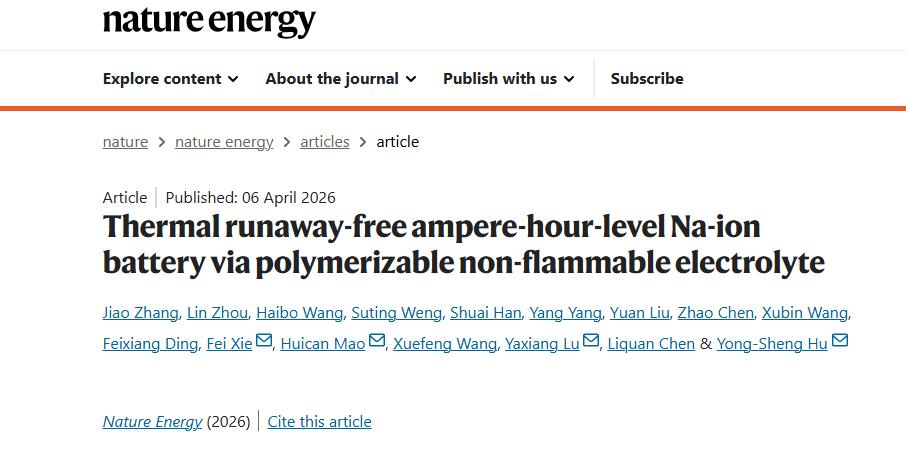 April 6, the Hu Yongsheng team at the Institute of Physics, Chinese Academy of Sciences, published a major breakthrough in 《Nature Energy》: the team successfully developed a polymerizable non-flammable electrolyte (PNE) with a self-protecting function, achieving the world’s first complete prevention of thermal runaway in ampere-hour–class sodium-ion batteries.