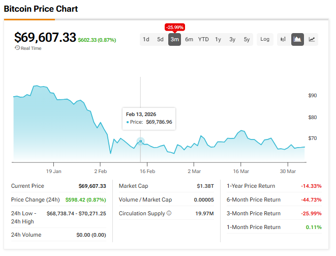 BTC is currently trading at $69,500.00 as traders and investors cheer media reports of a potential de-escalation in the Iran war. Specifically, reports say that the U.S. and Iran are discussing a potential 45-day ceasefire, which has financial markets up on the day.