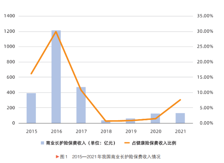 According to The Practice Research on China’s Commercial Long-Term Care Insurance in issue 12 of Shanghai Insurance in 2024 (hereinafter referred to as the “Practice Research”), China’s commercial long-term care insurance accounts for a relatively low share among health insurance and has lagged in development. Although it experienced rapid growth during the stage of personal insurance premium rate market-oriented reform (with 2016 premiums reaching RMB 120.8 billion, about 30% of health insurance), many products deviated from the essence of protection. In 2017, new regulatory rules standardized product design, and the industry adjusted dramatically. In 2018, the share of commercial long-term care insurance premiums within health insurance fell to 0.7%. In recent years, as population aging intensified and policies encouraged development, commercial long-term care insurance gradually warmed back up; by 2021, premiums recovered to RMB 13.2 billion.