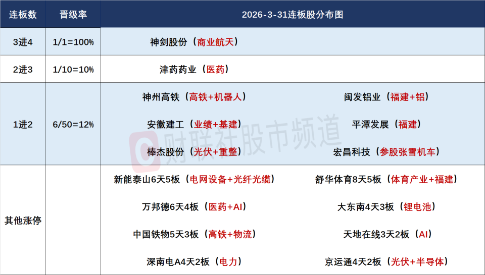The qualification rate for stocks to advance to the next stage of consecutive limit-ups dropped to 16.67%. Stocks with three or more consecutive limit-ups still remained at a low level of only 2. Among the 10 stocks that were on two consecutive limit-ups yesterday, only 1 managed to advance. After the earlier five-day consecutive limit-up “highest leader” Minowa Pharmaceutical broke its board and plunged, the maximum consecutive-limit height fell to four consecutive limit-ups—Shenjian Co., Ltd. As market continued to digest heightened expectations regarding tensions in the Middle East, the new-energy tracks that had previously led—led by lithium batteries and energy storage—as well as price-increase concepts driven by tight energy supply such as chemicals and coal saw a synchronized pullback today. Many stocks, including Jinniu Chemical, rushed close to limit-down; Haibo Si Chuang and Yiwei Lithium Energy, among others, landed near the top of the decline list. At present, uncertainty in market expectations for listed companies’ annual reports and first-quarter reports remains the main reason behind the gradual unraveling of the trend of “crowding into positions” in the market direction. Some lagging areas that previously had high-growth earnings expectations can still be actively explored.