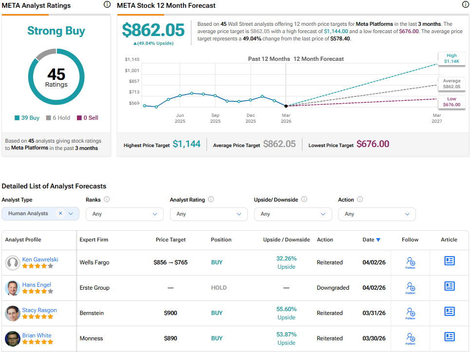 Turning to Wall Street, analysts have a Strong Buy consensus rating on META stock based on 39 Buys, six Holds, and zero Sells assigned in the past three months, as indicated by the graphic below. Furthermore, the average META price target of $862.05 per share implies 49% upside potential.