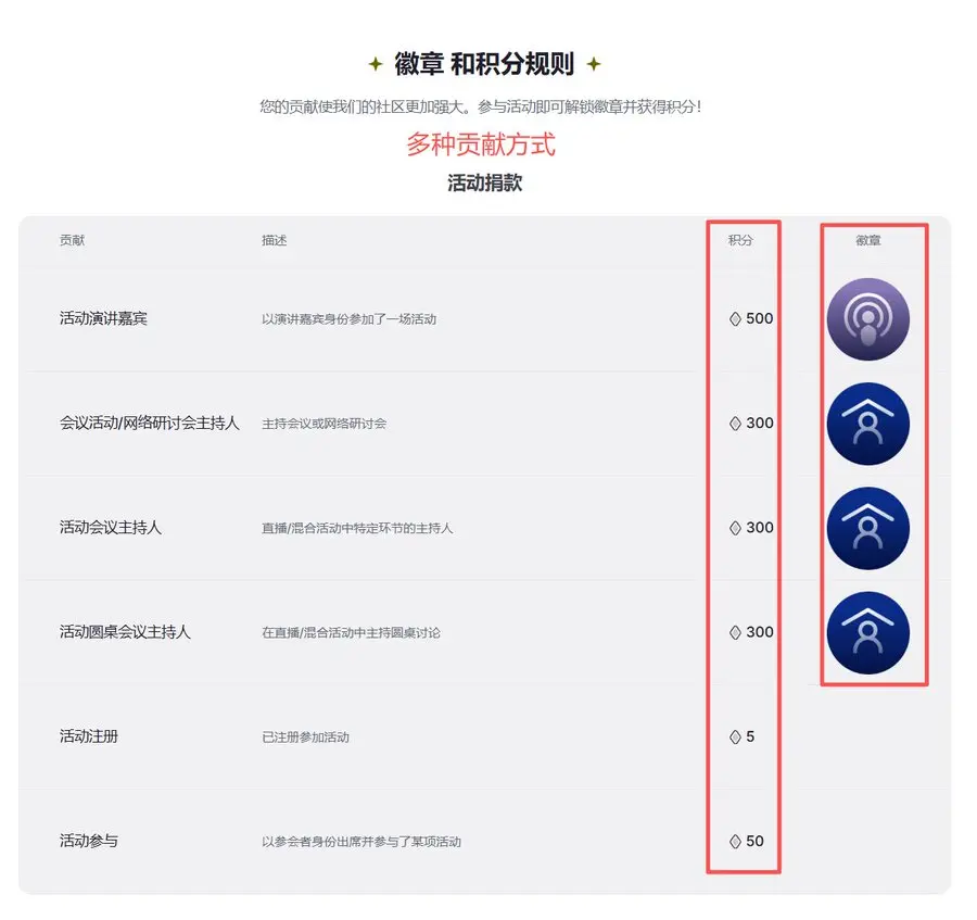 Contribution categories: there are five types—activity contributions, content contributions, forum contributions, community events, and other contributions. In addition to points rewards, different contributions also include extra badge rewards.