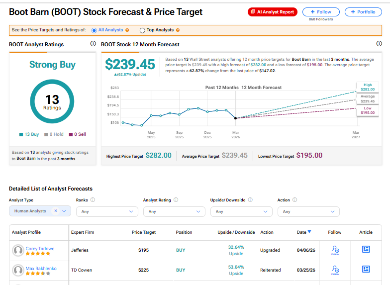 BOOT stock has a consensus Strong Buy rating among 13 Wall Street analysts. That rating is based on 13 Buy ratings issued in the last three months. The average BOOT price target of $239.45 implies 63% upside from current levels.