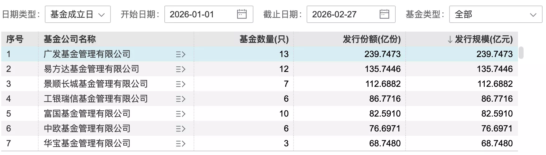 The leading-sector effect has been especially prominent in this issuance wave. Among them, 广发基金 (GF Fund) ranked first with 13 products and an issuance scale of nearly 24 billion yuan. 易方达基金 (E Fund), 景顺长城基金 (Invesco Great Wall), and others followed closely, with issuance scales all exceeding 10 billion yuan.