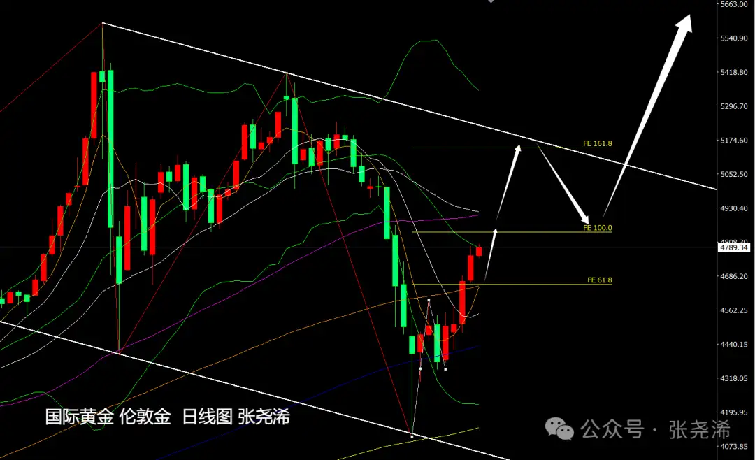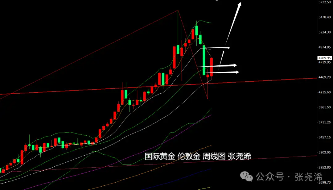 At the weekly level: Gold this week, as expected, continued last week’s pattern of bottoming out, rebounding, and stopping the decline into a bullish formation, along with rebound momentum, and it has moved further higher. It has also initially broken through the resistance of the midline, and bullish momentum is strengthening. Although it initially touched the 5–10 week moving average resistance and there is a risk of pullback, as long as this week’s close remains above the midline— or it breaks above the 5–10 week moving average resistance— then the outlook for the next phase is to refresh historical highs again.
