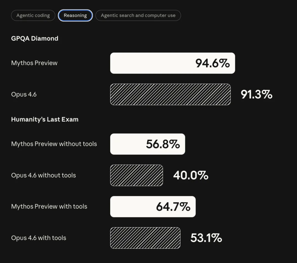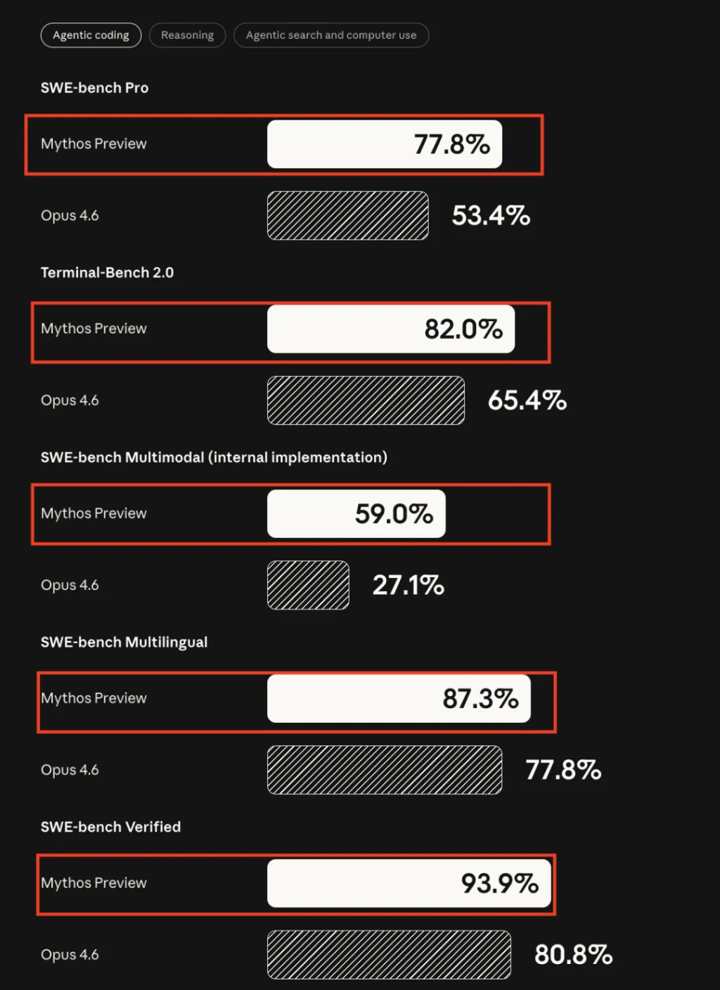 In plain terms, because this model is so powerful they’re adopting a safety testing mode: it will only be used internally by approved institutions and will not be opened to the public. Just how strong is it? Everyone can directly check the data—its code and reasoning capabilities completely outclass opus 4.6: