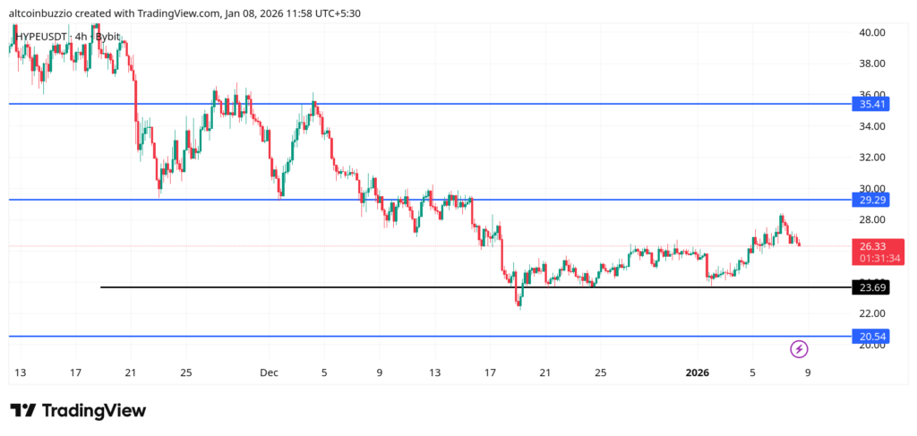Traders focus on $29.3 as the nearest reaction zone and $23.7 as downside defense. These levels define the active range.