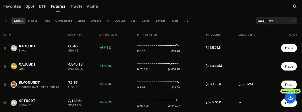 Gateの金属取引エリアでは、金と銀のUSDT無期限契約取引を提供し、ユーザーは同じプラットフォーム上で価格変動を監視し、取引ポジションを構築できる。