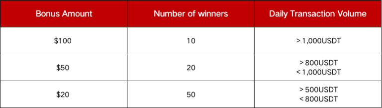 During the event, users who participate in perpetual contract transactions (buy+sell) with a daily transaction volume ≥500USDT will be eligible for the lottery. We will randomly select 80 users from eligible users to share $3000. The bonus amount, number of winners and transaction volume are as follows: