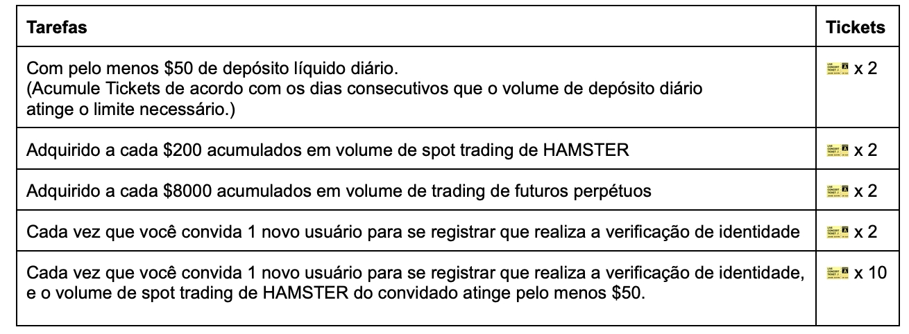 - As recompensas serão em HAMSTER, com um total de 5,000,000 HAMSTER no prêmio. Os participantes devem completar qualquer trading spot de HAMSTER durante o evento para serem elegíveis à divisão do Prêmio de Tickets. As recompensas serão distribuídas em tokens do projeto em até 14 dias úteis após o término da campanha (“Carteira”–“Extrato”). O anúncio da distribuição das recompensas será divulgado no Gate News.