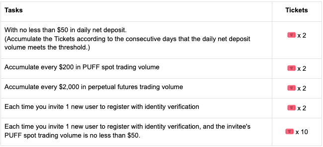 4.As recompensas serão em PUFF, com um prizepool total de 191.519 PUFF. Os participantes devem concluir qualquer negociação à vista PUFF durante o evento para serem elegíveis para dividir o Ticket Prizes Pool. As recompensas serão distribuídas em tokens do projeto dentro de 14 dias úteis após o término da campanha ("Carteira"–"Fatura".) O anúncio de distribuição de recompensas será divulgado em Notícias Gate.