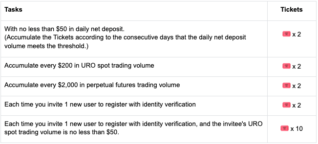 Complete qualquer uma das tarefas para obter Bilhetes durante o evento e, finalmente, dividir a recompensa com base no número de Bilhetes acumulados. O valor total do prémio é de $8,000!