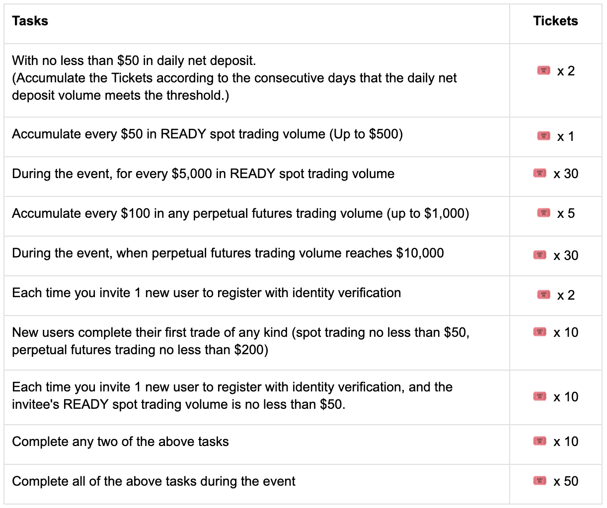 4.As recompensas estarão em READY, com um total de 500.000 READY no prêmio. Os participantes devem concluir qualquer negociação à vista READY durante o evento para serem elegíveis para dividir o prêmio do Pool de Prêmios em Bilhete. As recompensas serão distribuídas em tokens do projeto dentro de 14 dias úteis após o término da campanha ("Carteira"-"Fatura"). O anúncio de distribuição de recompensas será divulgado em. Notícias Gate.