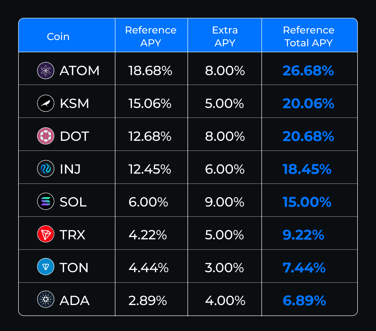 A Gate está a disponibilizar mais benefícios na linha de produtos de estaca! Além dos anteriormente incomparáveis 50% de APY em USDE, estamos agora a oferecer incentivos adicionais para 8 moedas principais, incluindo SOL, TRX, TON, KSM, ATOM, INJ, ADA e DOT. Subscreva agora para desfrutar das taxas anualizadas mais altas disponíveis e maximizar os seus retornos!