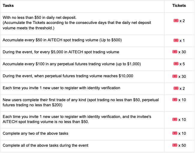 4.As recompensas serão distribuídas em tokens AITECH, com um prêmio total de 72.833 AITECH. Os participantes precisam realizar qualquer negociação spot de AITECH durante o evento para se qualificarem à divisão do prêmio de Tickets. As recompensas serão distribuídas dentro de 14 dias úteis após o término da campanha na seção "Carteira"–"Conta". O anúncio de distribuição será publicado no Gate News