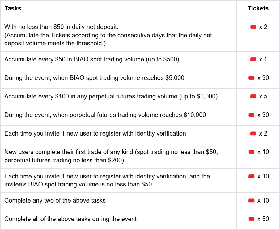 Complete qualquer uma das tarefas para obter Bilhetes durante o evento e, finalmente, dividir a recompensa com base no número de Bilhetes acumulados. O prêmio total é de $23,000!