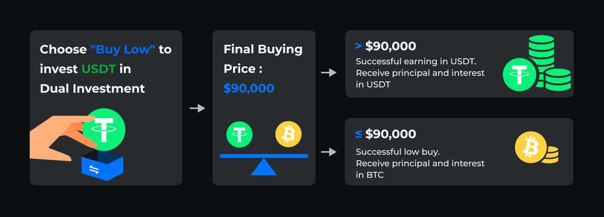 1.Alice investe USDT num produto de investimento duplo com um prazo de 3 dias e um preço-alvo de $90,000 para comprar BTC a baixo preço. Na data de liquidação, se: