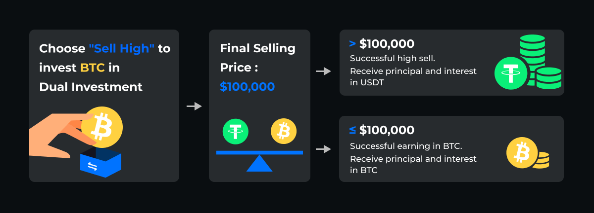2.Bob investe BTC num produto de Investimento Duplo com um prazo de 3 dias e um preço-alvo de $100,000 para vender BTC alto. Na data de liquidação, se: