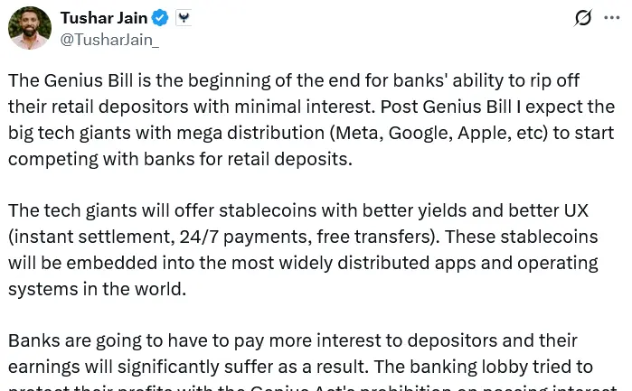 "Após a aprovação do Genius Bill, espero que os grandes gigantes da tecnologia com mega distribuição comecem a competir com os bancos por depósitos de retalho," acrescentou, argumentando que eles ofereceriam melhores rendimentos em stablecoins com uma melhor experiência do utilizador para liquidações instantâneas e pagamentos 24/7 em comparação com os bancos tradicionais.