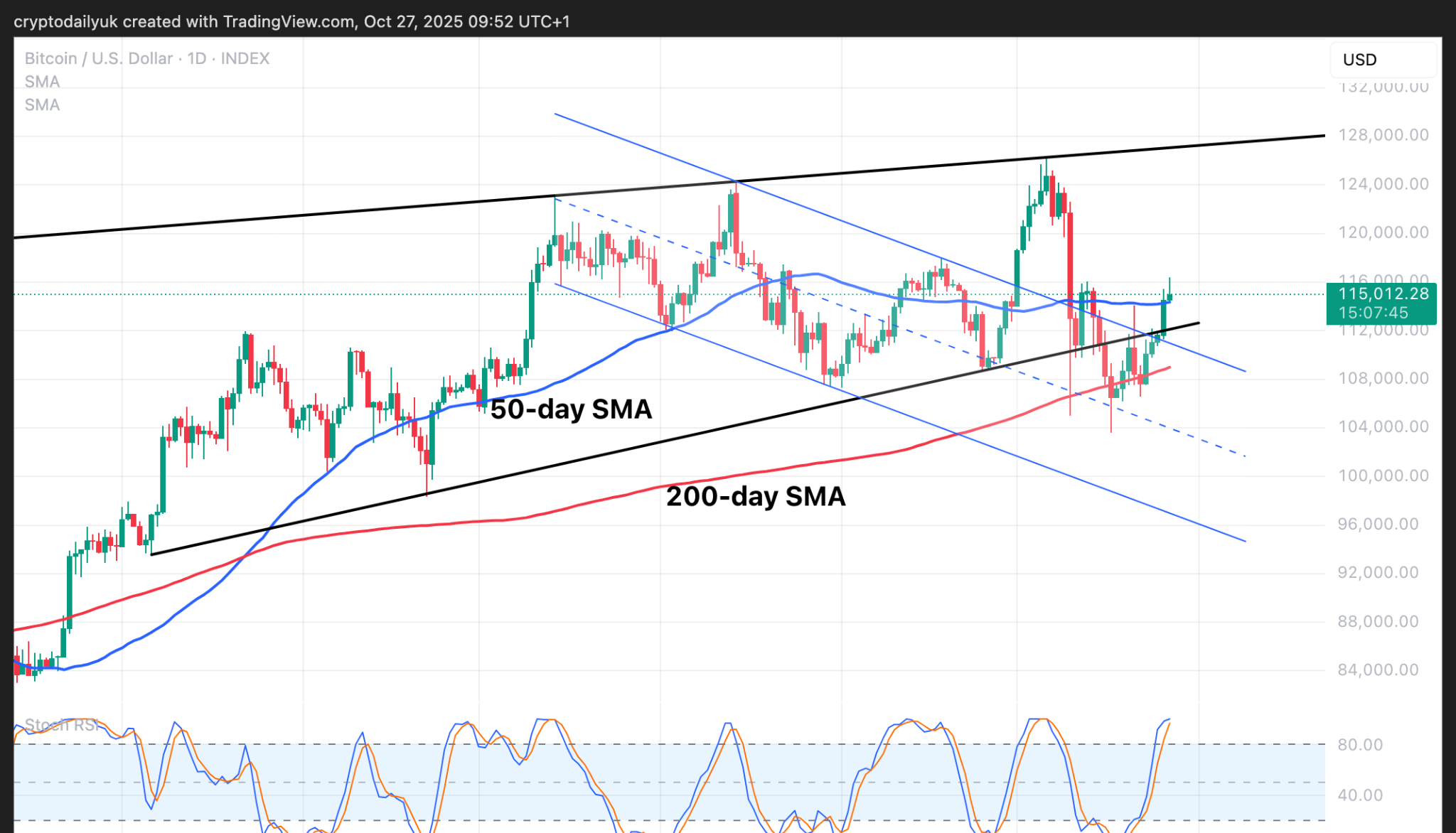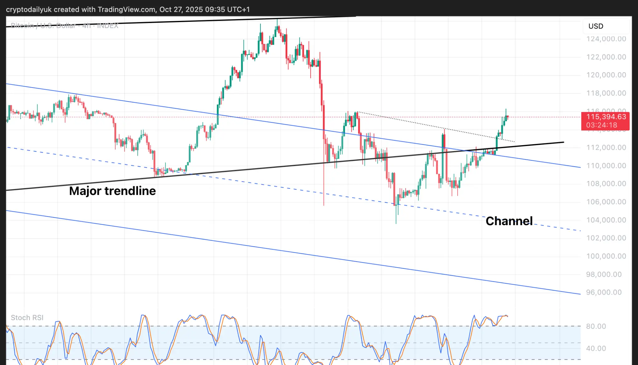 Na sexta-feira, a história era muito diferente. O preço $BTC parecia que seria rejeitado do topo do canal e da principal linha de tendência ascendente. Os touros tinham outras ideias, e durante o fim de semana o preço subiu fortemente. Na segunda-feira, o preço atingiu $116,400 antes de talvez ter atingido o pico neste nível.