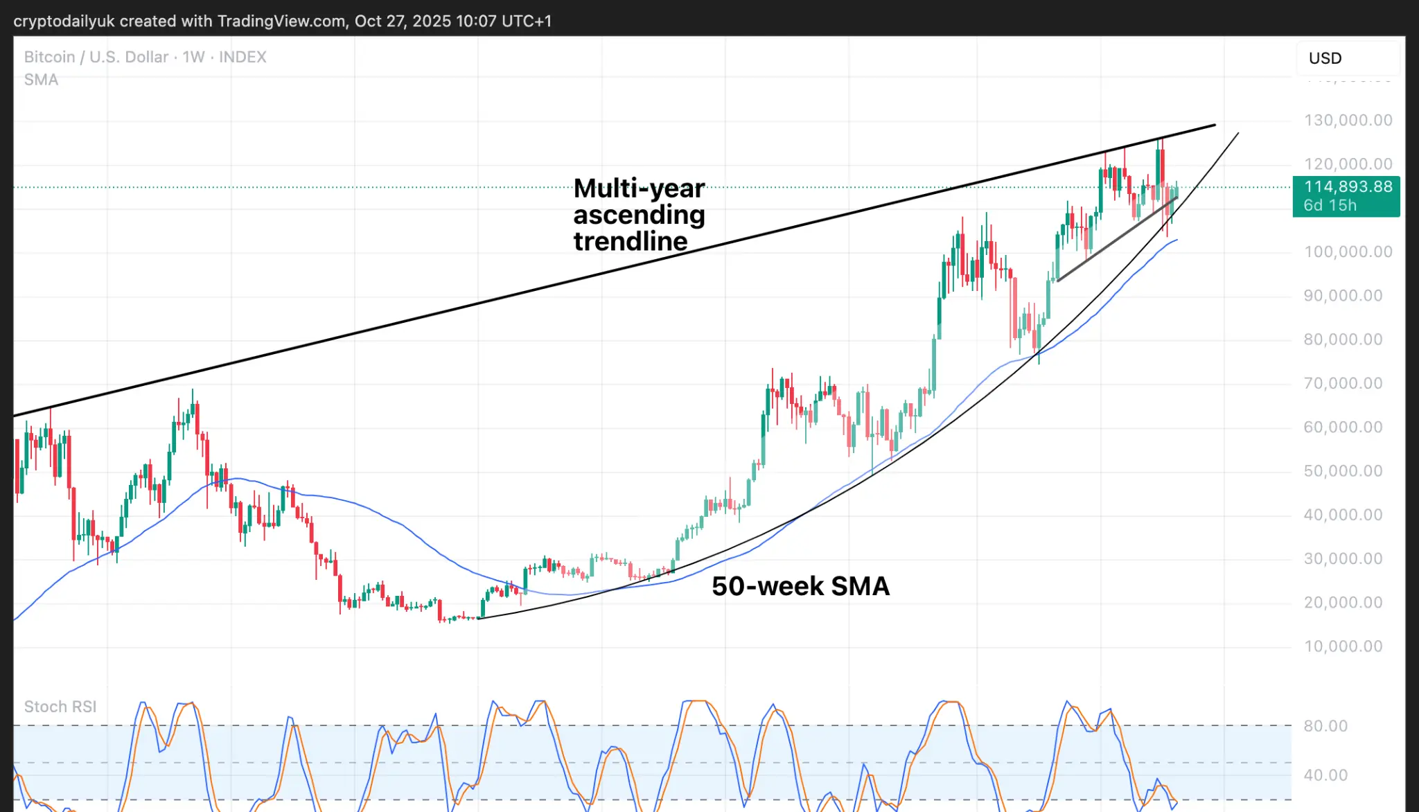 No gráfico diário, pode-se ver que o $BTC preço está atualmente a tentar manter-se acima da média móvel simples de 50 dias, após ter voltado a subir acima dela na segunda-feira. Resta saber se os touros conseguem fazer isso, especialmente considerando que os indicadores Stochastic RSI podem estar prestes a cruzar para baixo.