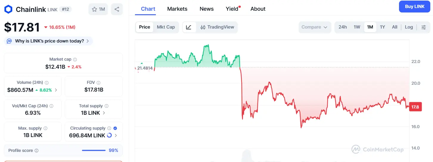 O gráfico atual do LINK espelha seu último ciclo antes de uma grande explosão. Se esse padrão se repetir, o LINK poderá testar novamente $50 na próxima alta de altcoins. Por enquanto, está sendo negociado perto de $18, com um nível de rompimento a ser observado em torno de $19,90.