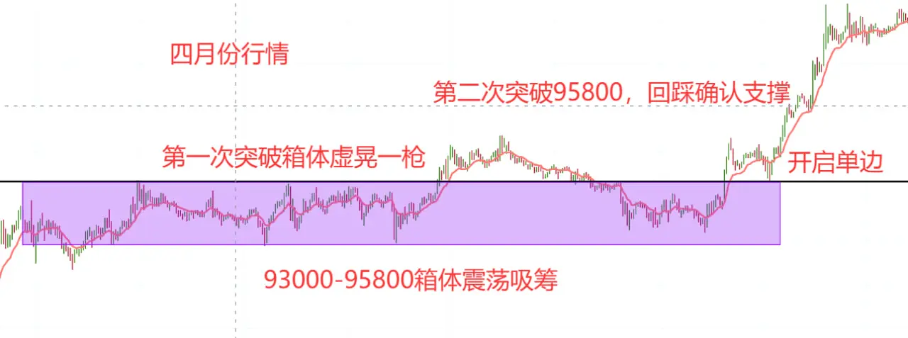 Conseguiu ver claramente? Pessoal, em abril o Bitcoin formou uma grande faixa de consolidação entre 93000-95800, e depois rompeu a formação de topo de cabeça e ombros, completando uma segunda rodada de aceleração de alta e atingindo novos máximos históricos. Nesta fase de arranque, o mercado manteve-se sempre sob pressão em 95800, antes de romper e voltar a testar para confirmar o suporte. Podemos afirmar que esta área é a zona de realização de lucros desta rodada do mercado em alta. Agora que o mercado voltou a 95800, é certo que os lucros serão continuamente realizados ao longo do caminho, mas a posição base ainda existe. Esta é uma área densa de troca de posições entre touros e ursos. Independentemente de subir ou descer posteriormente, 95800 precisa de dar tempo suficiente ao mercado para uma resposta e para uma nova troca de posições.