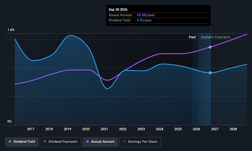 A empresa tem uma longa história de pagamento de dividendos estáveis. O pagamento anual durante os últimos 10 anos foi de €0,20 em 2016, e o pagamento do último exercício fiscal foi de €0,35. Isso implica que a empresa cresceu suas distribuições a uma taxa anual de cerca de 5,8% nesse período. O dividendo tem crescido de forma bastante consistente há vários anos, proporcionando uma boa renda aos seus acionistas.