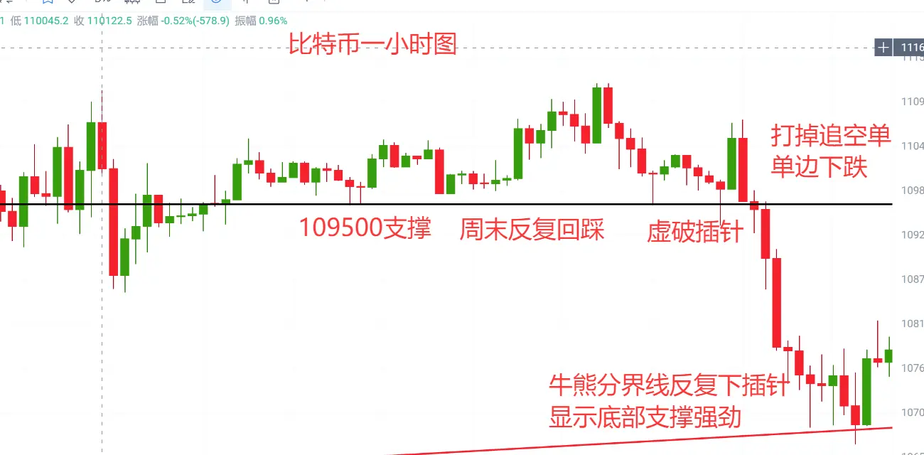 109500 voltou a testar o suporte, entrada na ordem longa, ordem curta aguardando a queda para entrar. Na manhã de segunda-feira, o mercado iniciou, a primeira onda quebrou 109500 eliminando as ordens longas de curto prazo, enquanto a ordem curta entrou. No entanto, nesse momento, o mercado imediatamente quebrou falsamente 109500 com um movimento para baixo e rapidamente se recuperou, alcançando o máximo de 110700, eliminando as ordens curtas. Em seguida, sem aviso prévio, começou uma queda acelerada, que levou o mercado diretamente à linha de divisão entre touros e ursos no ponto de suporte de 106800. Então, toda a tarde de segunda-feira, o mercado continuou testando para cima na posição da linha de divisão entre touros e ursos, mostrando um forte suporte na parte inferior.