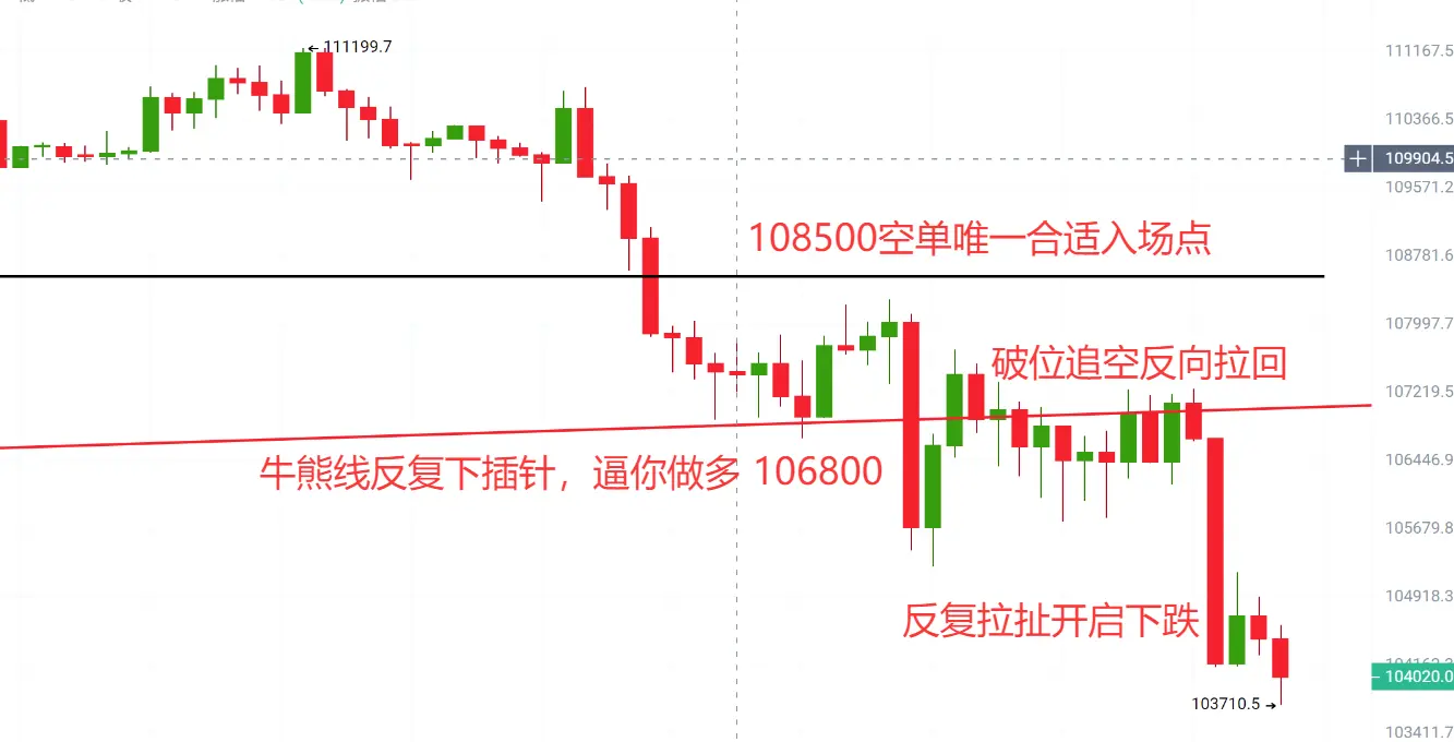 Na fase em que caiu abaixo da linha de touros e ursos na noite passada, falamos sobre a ordem curta que foi estopada e as ordens longas de curto prazo que também foram estopadas, mas as ordens longas de tendência não foram liquidadas, porque na fase em que caiu abaixo da linha de touros e ursos de 106800, o mercado ainda estava em 107000, passando por várias oscilações, e a quebra não ocorreu na segunda metade da noite, mas antes da meia-noite. O tempo também mostra que a maioria dos pequenos investidores não estava descansando; ao ver um rebote tão fraco, havia a possibilidade de uma aceleração da queda. Embora eles não se atrevessem a abrir ordens curtas, as ordens longas de tendência podiam ser liquidadas.
