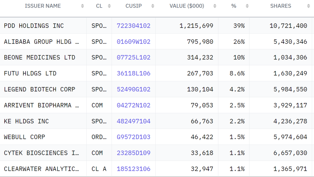 Especificamente, as dez maiores posições da HHLR Advisors são Pinduoduo, Alibaba, BeiGene, Futu Holdings, Legend Biotech, ARRIVENT BIOPHARMA INC, KE Holdings, WEBULL CORP, CYTEK BIOSCIENCES INC e CLEARWATER ANALYTICS HLDGS I.