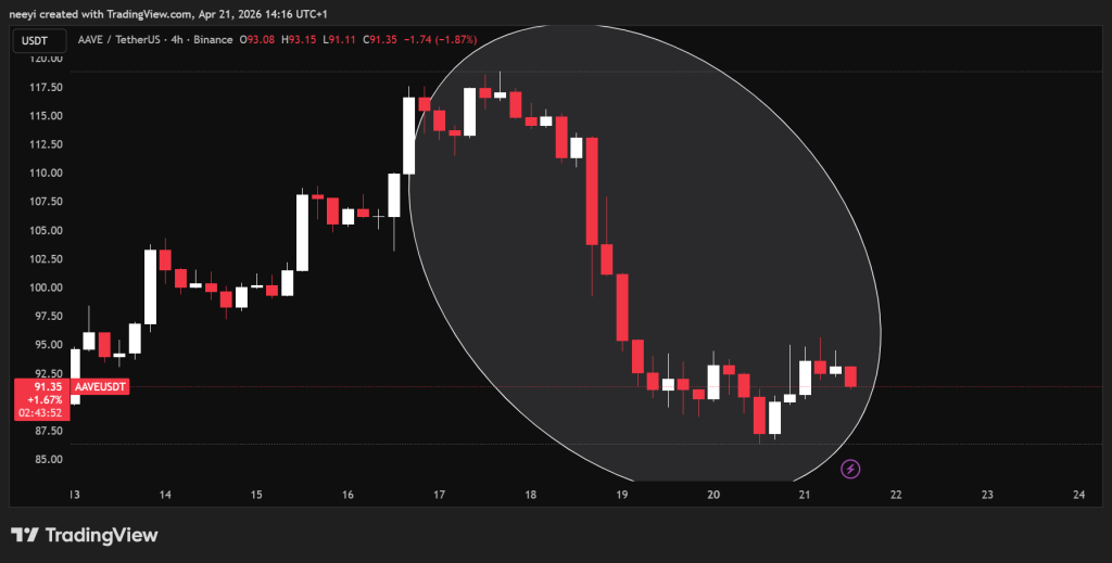 Uma análise da ação do preço do AAVE mostra um mercado reagindo a mais do que apenas uma exploração. A queda seguiu uma mistura de saídas internas, contratempos técnicos e um grande ataque externo que afetou a liquidez em todo o protocolo.