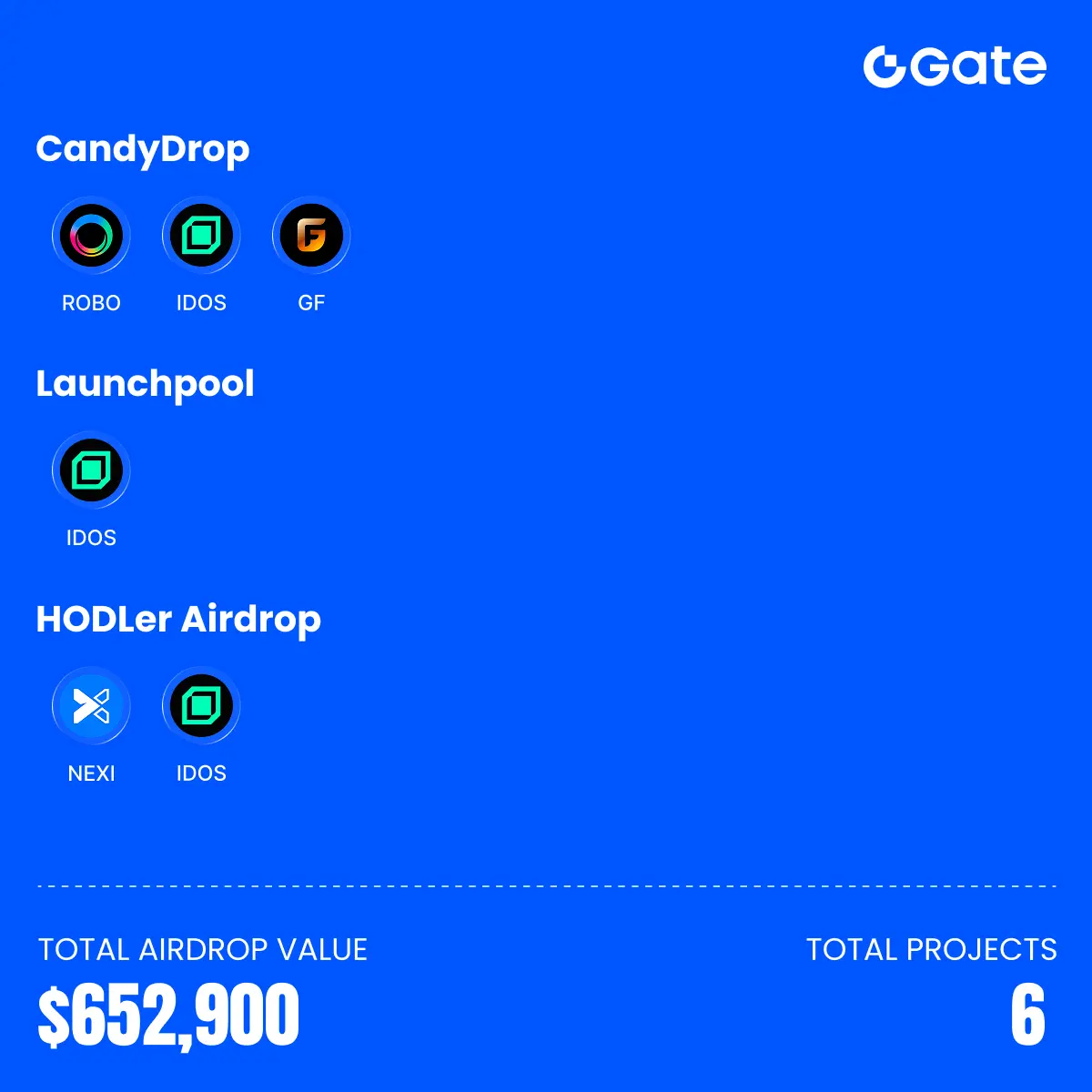 С 1 по 15 марта 2026 года Gate запустила 5 новых проектов, 3 проекта CandyDrop, 1 проект Gate Launchpool и 2 проекта аирдропа для держателей. Общая стоимость аирдропа составила $652 900.