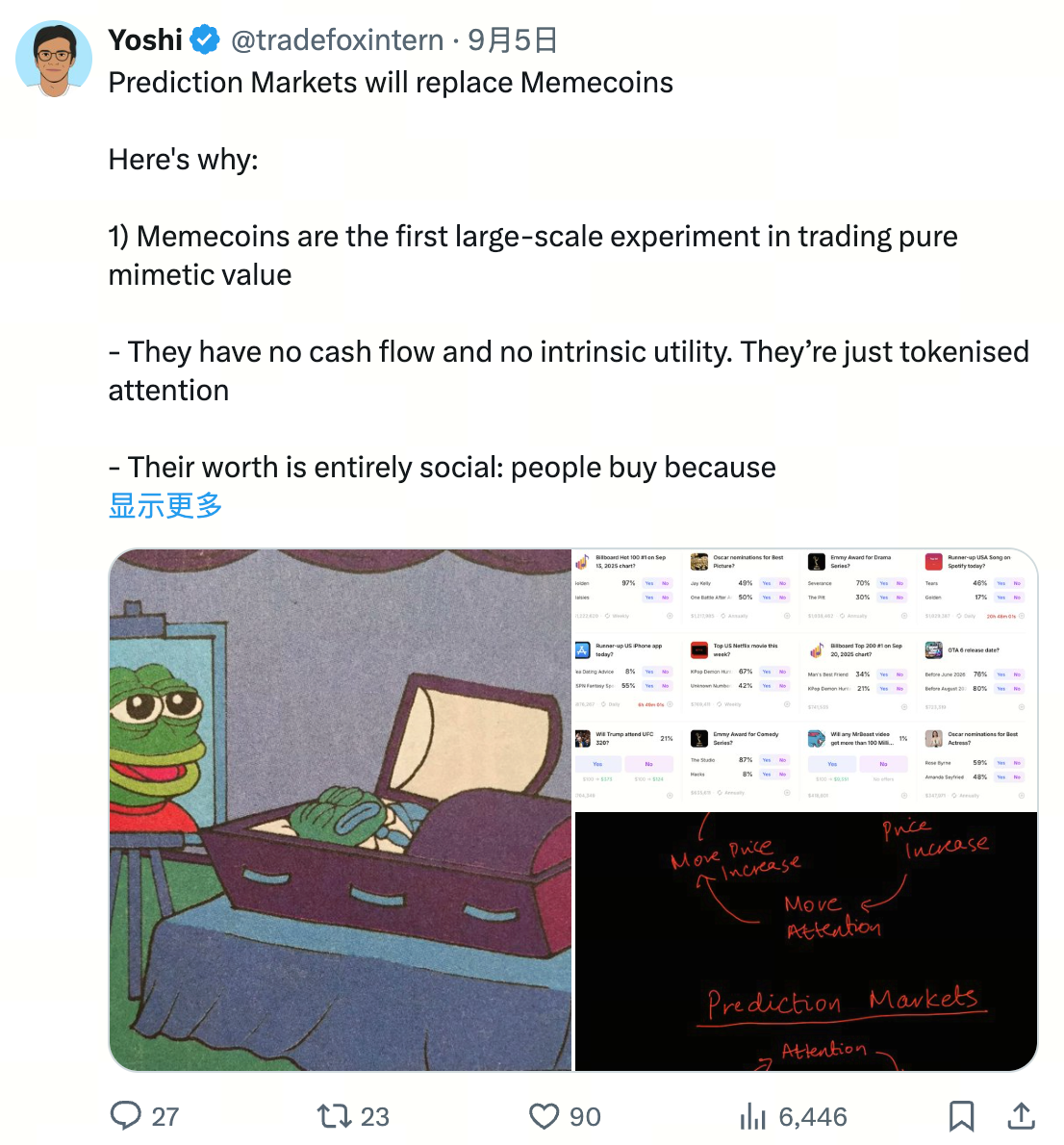 Вот интересный пост от @ tradefoxintern о том, почему prediction markets заменят мемкоины: