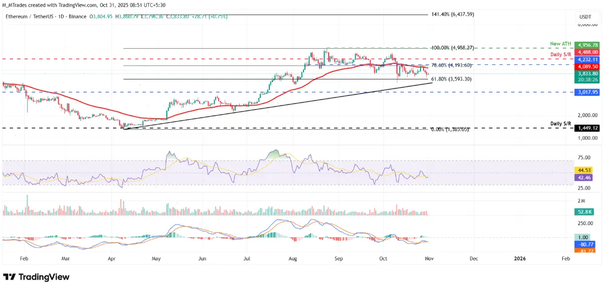 Ethereum (ETH) испытывает сильное давление падения, так как был отвергнут на уровне сопротивления 4.232 USD в понедельник, и к четвергу этот токен снизился на 8,86%, в настоящее время торгуется около 3.833 USD.