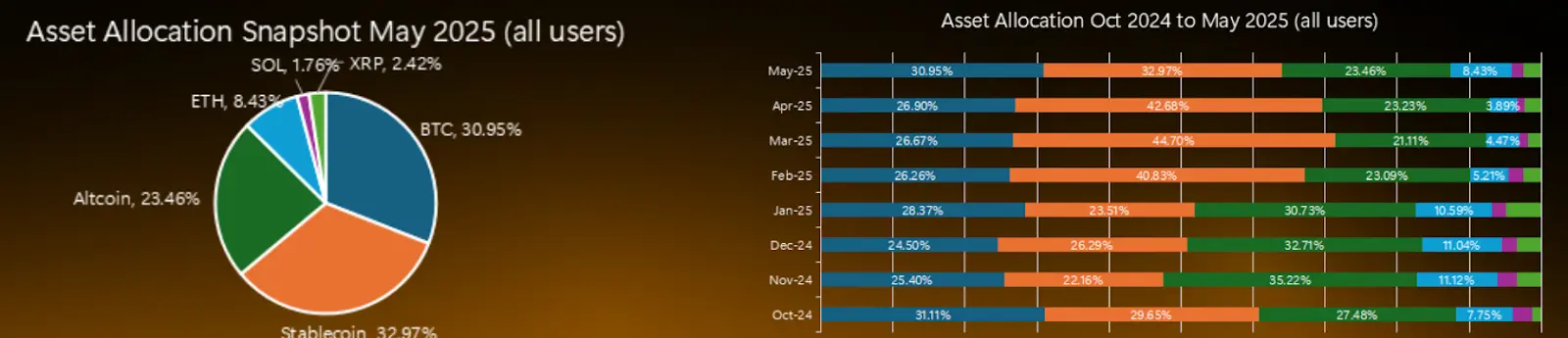 По состоянию на май, биткойн составлял одну треть, или 30,95%, от общего объема активов в портфелях инвесторов, увеличившись с 25,4% в ноябре 2024 года.