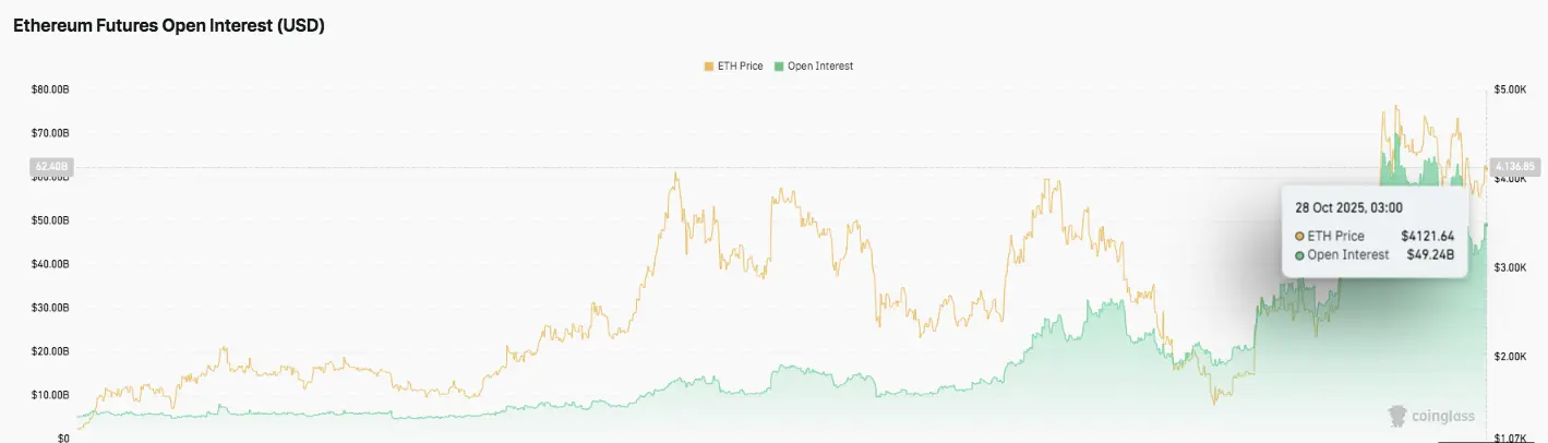 Открытый интерес по фьючерсам на Ethereum вырос до 49,24 миллиарда долларов, что является самым высоким уровнем с середины 2025 года. Этот резкий рост сигнализирует о растущем участии трейдеров и притоке капитала на рынки деривативов.