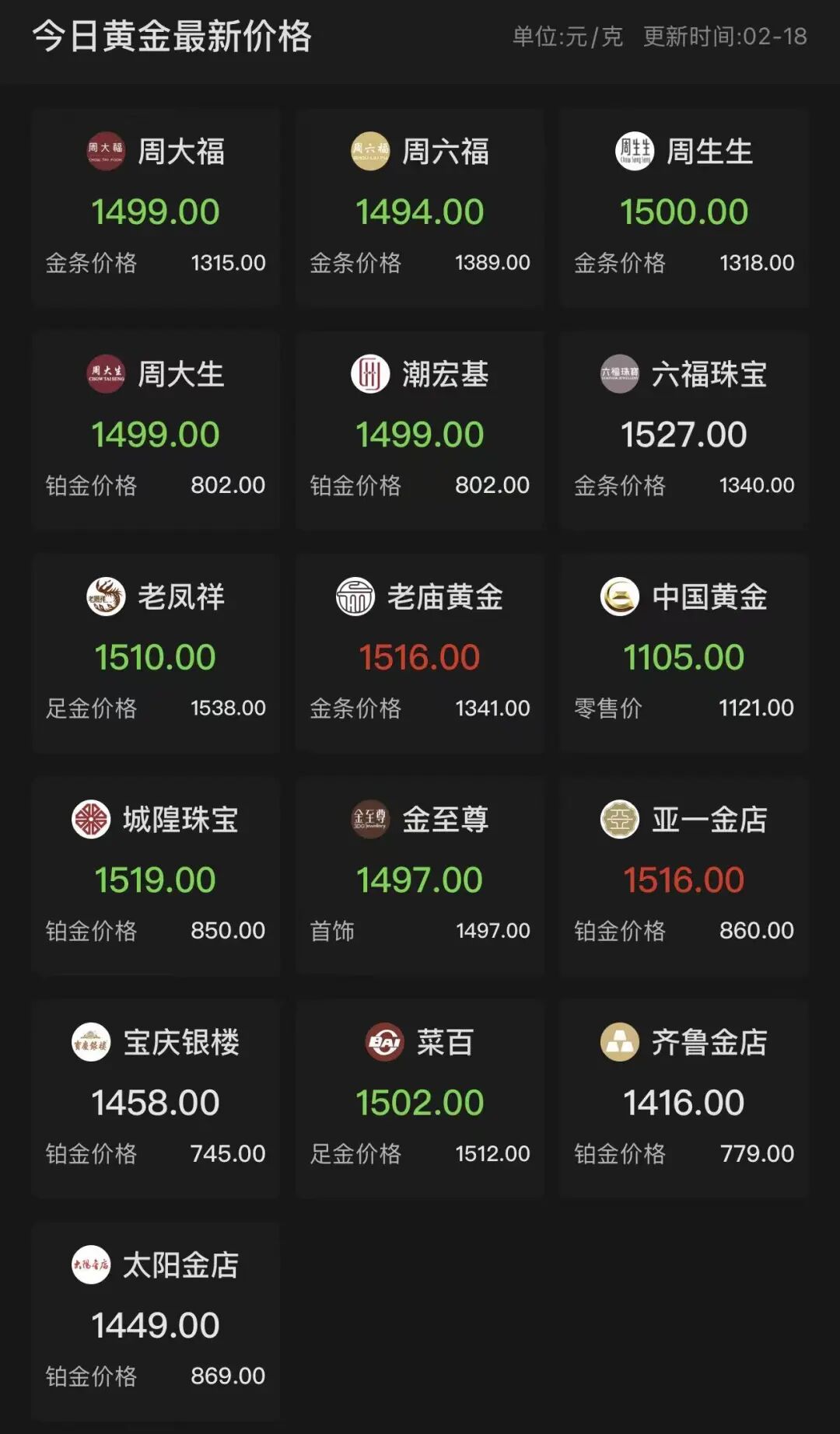 Однако 18 февраля, согласно информации Eastmoney, цены на внутренние чисто-золотые украшения у нескольких ювелирных брендов снизились ниже 1500 юаней, Zhou Dafu, Zhou Shengxian и Chao Hongji предлагают по 1499 юаней за грамм. Ювелирные бренды Luk Fook, Lao Miao Gold, Chow Sang Sang, Lao Feng Xiang и Caibai держат цены на уровне 1500 юаней, соответственно по 1527, 1516, 1500, 1510 и 1502 юаня за грамм.