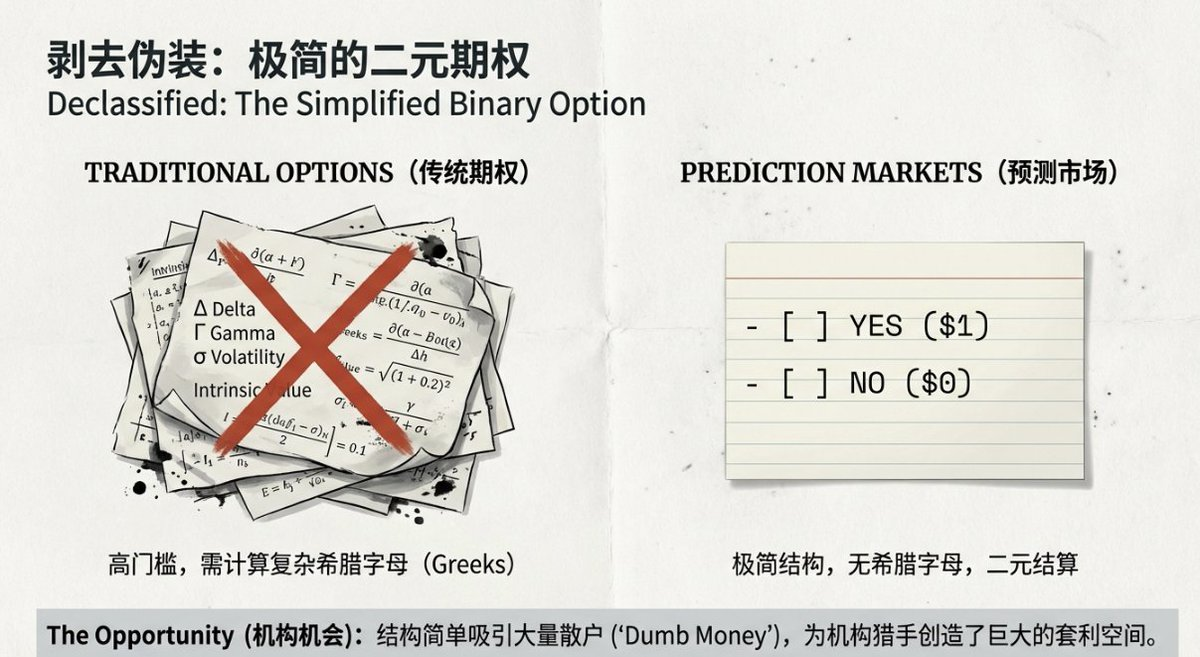 This win-win logic helps investors stay composed in turbulent markets. Unlike traditional options that require calculating implied volatility (Greeks), prediction markets reduce complex financial models to simple binary outcomes, dramatically lowering the barrier for everyday participants in risk management.