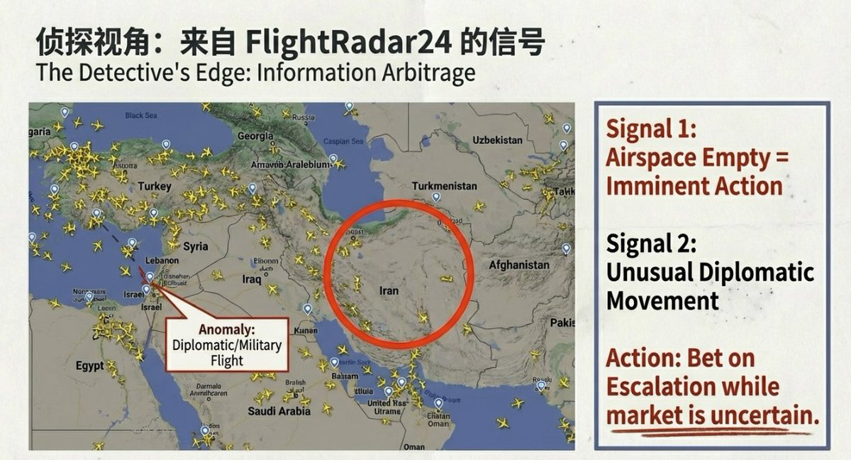 Zixi described how he profited from the Iran situation: experts ignored diplomatic statements and instead monitored FlightRadar24 in real time. When all commercial flights vanished over Iran, or an unusual Russian military plane flew directly from Israel to Russia, the truth became clear.