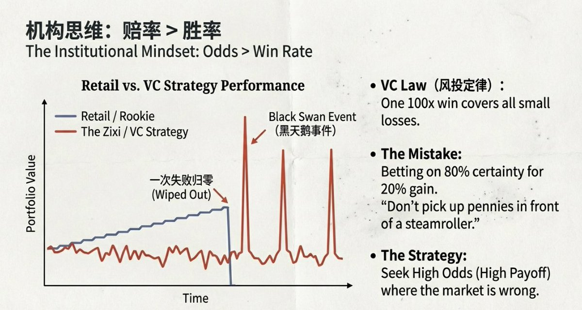 Those seemingly certain bets can be wiped out by a single black swan event—like a sudden geopolitical upheaval—erasing all your previous nine wins overnight. True professionals hunt for asymmetric opportunities: for example, Chess once saw Manchester City play away against an obscure Norwegian team in the Champions League, bought in at extremely low odds, and turned $100 into $700. This approach mirrors the logic of primary market VC investing: pursue high-odds opportunities, not marginal spreads.