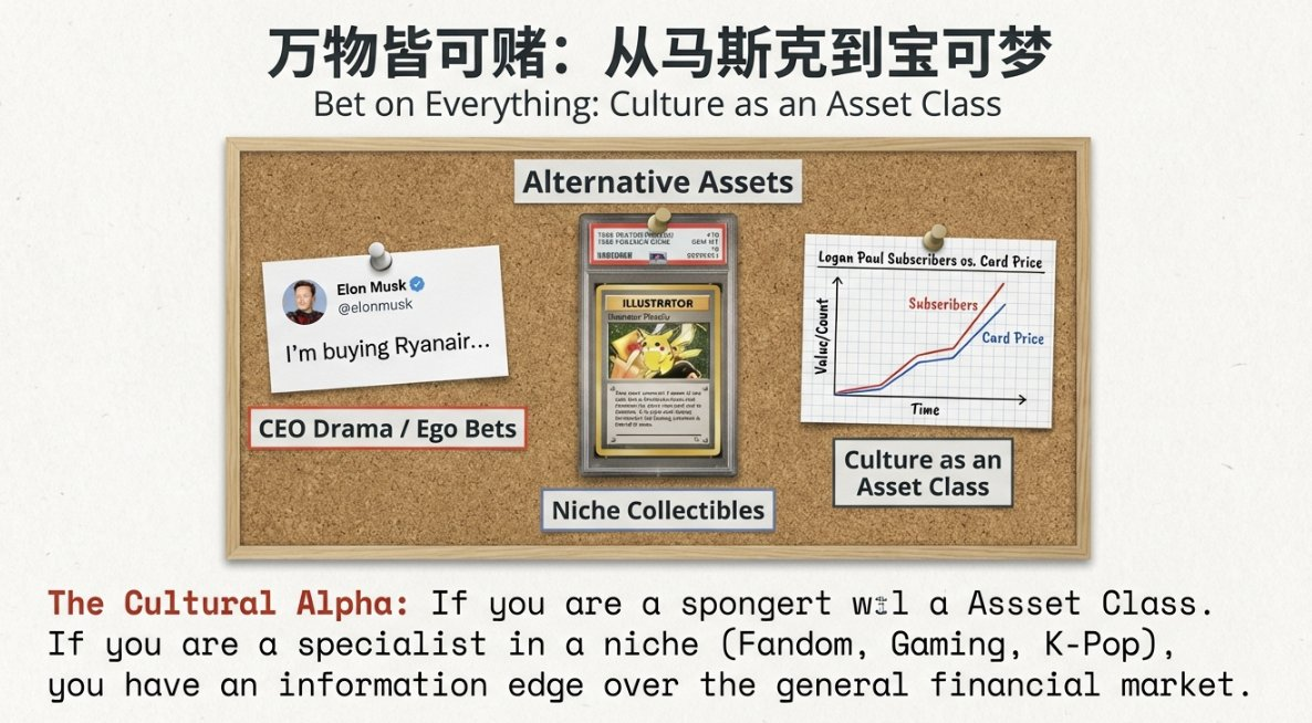 Whether it’s Taylor Swift’s chart rankings, Elon Musk’s rumored Ryanair acquisition, or the outcome of the Oscars, prediction markets offer a low-cost way to participate in major narratives or entertainment gossip. They let fans back their opinions with real money. If you win, your judgment is validated; if you lose, it’s an inexpensive emotional release. This healthy outlet is becoming a new social currency for people under modern pressures.