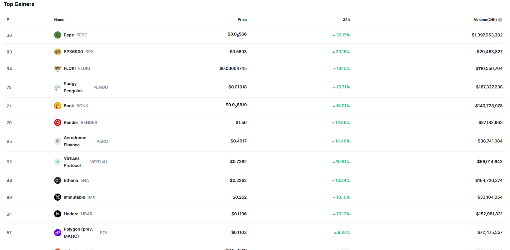 While PEPE wasn’t the only memecoin to rise at this point, Dogecoin (DOGE) increased by 9.2%; Shiba Inu (SHIB) by 9.8%; Floki Inu (FLOKI) by 19.1%; Bonk (BONK) by 15%; Pudgy Penguins (PENGU) by 15.7%; and SPX6900 (SPX) by 20% during the day.