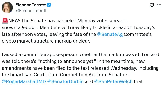 The Senate markup for Tuesday comes after it was postponed on Jan. 15 due to disputes over stablecoin rewards restrictions and other decentralized finance provisions, which led major industry participants to withdraw support.