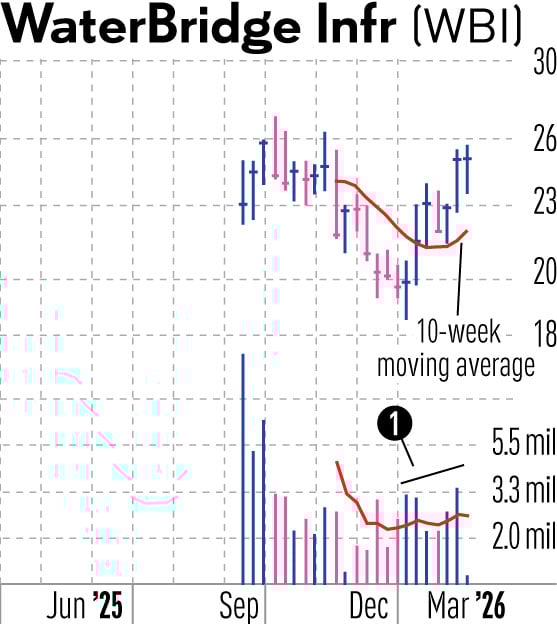 Finally, WaterBridge Infrastructure (WBI) doesn’t report earnings until March 16, but the provider of water management solutions to the oil-and-gas industry is setting up in a first-stage cup base. Several weekly price gains in above-average volume along the right side of the base point toward signs of institutional accumulation (1).