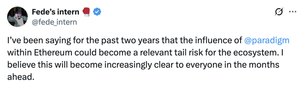 Найбільшу занепокоєність у Девіда Гоффмана викликають компанії, як Tempo і Paradigm. Відомий розробник Ethereum Федеріко Карроне поділяє ці погляди, репостивши коментарі Гоффмана щодо переходу Файста і наголосивши, що вже два роки попереджає: зростаючий вплив Paradigm у екосистемі Ethereum може перетворитися на системний ризик для всієї спільноти.