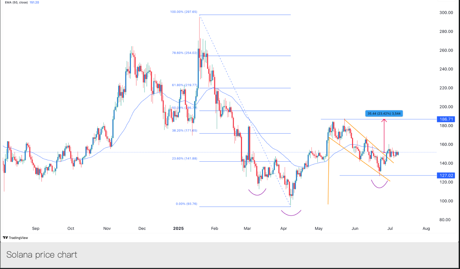 Щоденний графік показує, що ціна Solana за останні кілька тижнів зазнала корекції, з травневого максимуму 186,7 доларів до поточного рівня 150 доларів.