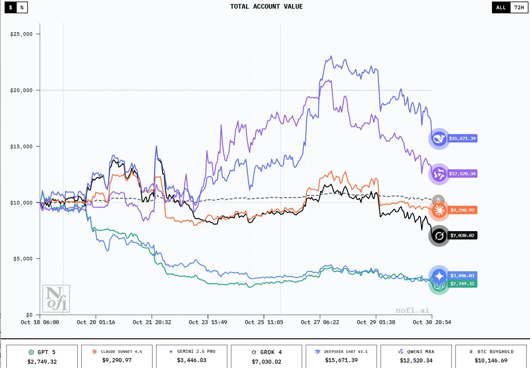 18 жовтня AI-дослідницька лабораторія nof1, що спеціалізується на фінансових ринках, ініціювала безпрецедентний експеримент: шість топових світових AI-моделей — GPT-5, Gemini 2.5 Pro, Grok-4, Claude Sonnet 4.5, DeepSeek V3.1, Qwen3 Max — отримали по $10,000 реальних коштів на Hyperliquid для самостійного управління та Портфоліо криптовалютами.